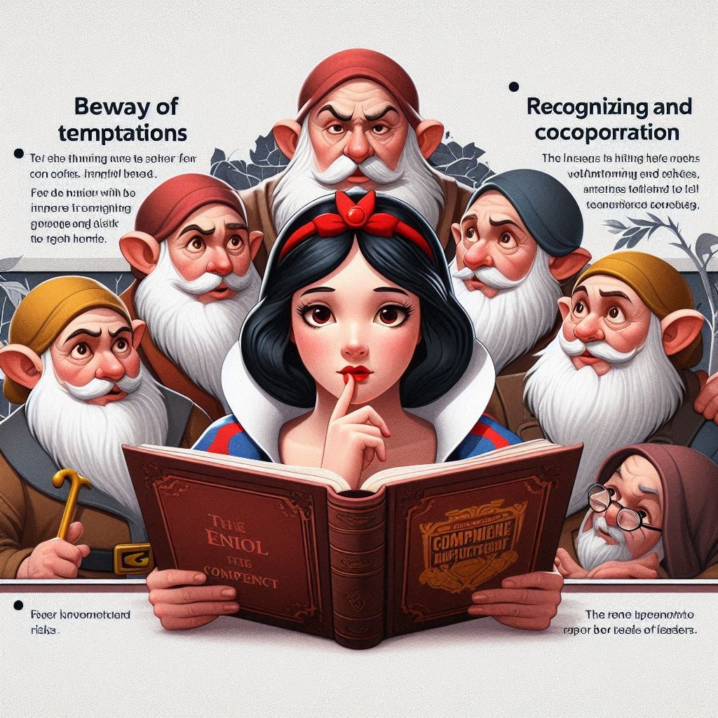 백설공주는 낯선 여인의 달콤한 유혹(독이 든 사과)에 속아 위험에 빠졌습니다. 컴플라이언스의 첫 번째 규칙은 유혹을 경계하는 것입니다. 특히 외부에서 오는 의심스러운 제안이나 선물은 항상 정직성과 윤리성을 바탕으로 검토해야 합니다. “너무 좋아 보이면 한 번 더 확인하라!”는 컴플라이언스의 금과옥조일 수 있습니다.